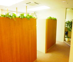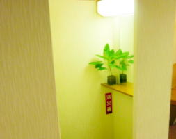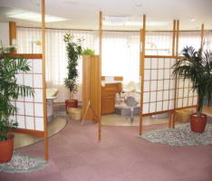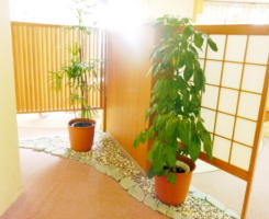 | 院内緑化に努めています。 また各ユニットを障子張りの格子で区切っています。 |